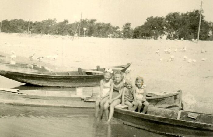 Sinka Ilona az 1940-es években barátnőivel, iskolatársaival a Duna partján. A képen jól látszik, hogy milyen alacsony volt a töltéspart. A csónakok arról tanúskodnak, hogy a lakosok halászni is jártak. Karvának egy hivatalos halásza volt, a Varga bácsi, aki a Gurgyal falurészben lakott.