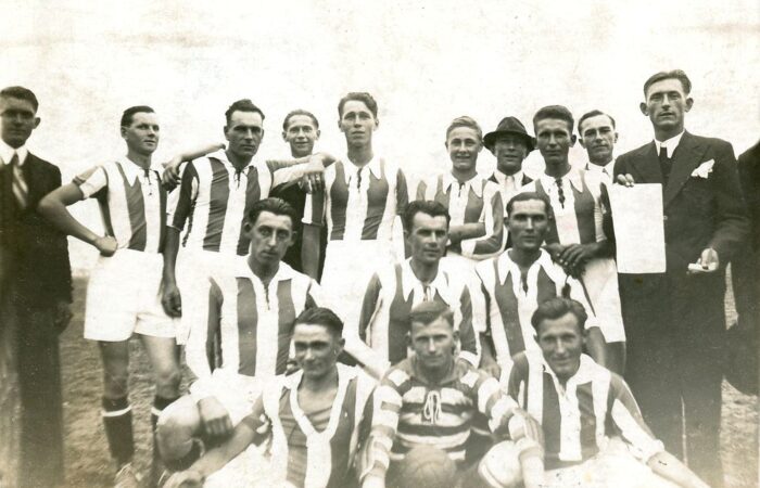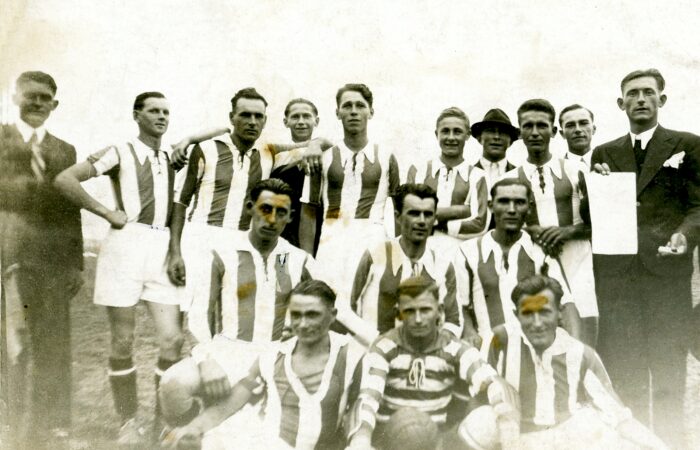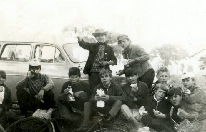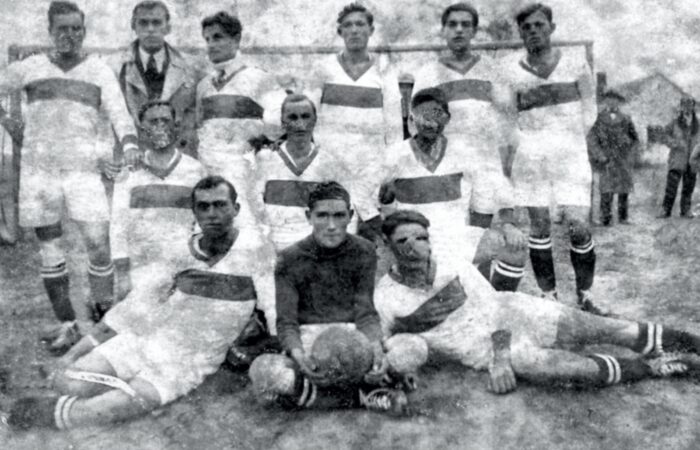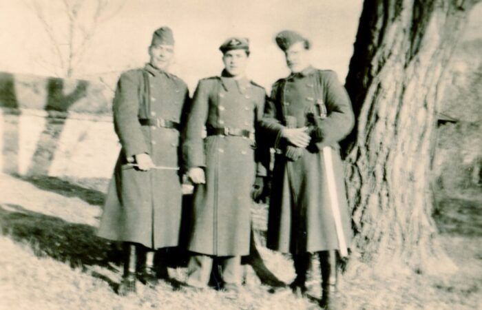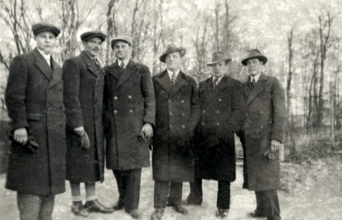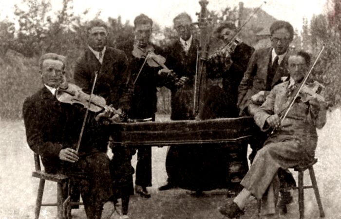 Balról a második Csókás János, mellette Zsapka xxx (Zsapka Ferenc apjának testvére), jobbról a második Pollák István, ünnepség előtt egy közös képen a „Barina” falurészen.