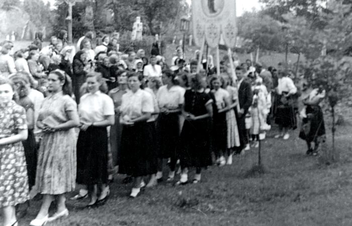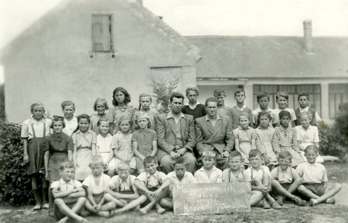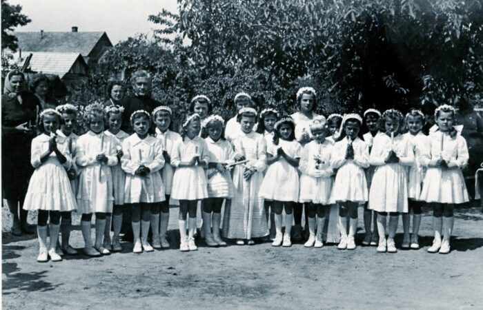 Karvai elsőáldozás, kb. 1956-ben. Koczab Vilmos plébános úr vezetésével, aki Dunamocs községből motorkerékpáron járt át misét tartani, és oktatni a gyerekeket. Mögötte Novotnyné Kinczer Magda tanító néni, balról első asszony Trnka Mitas Manci, 2. lány balról Ovszenák (Zsapkáné) Kati, mellette Hegedűs (Pereszlényiné) Julianna.