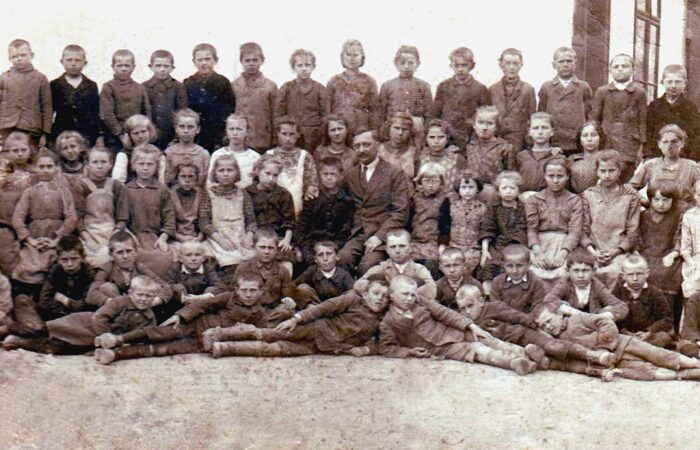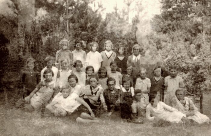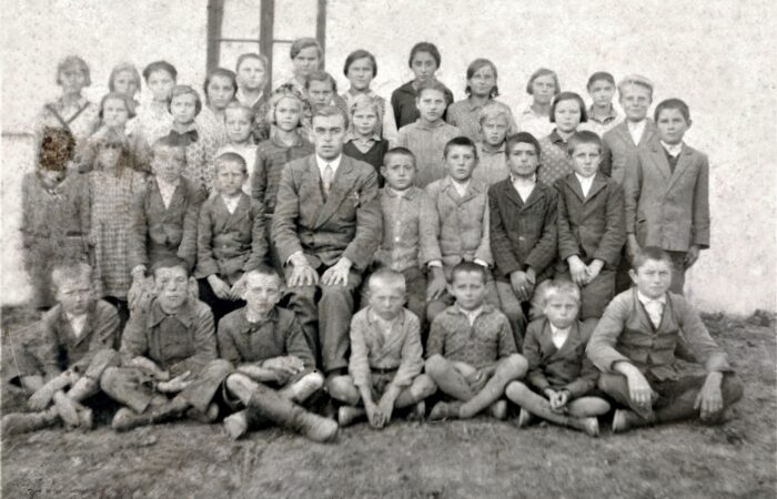 Karvai iskolások, Vilmos Béla tanító úrral, a diákok között a tanító úr mögött, bal oldalt a második lány Hegedűsné Fehér Mária Magdolna (szül. 1922), cca. 1934