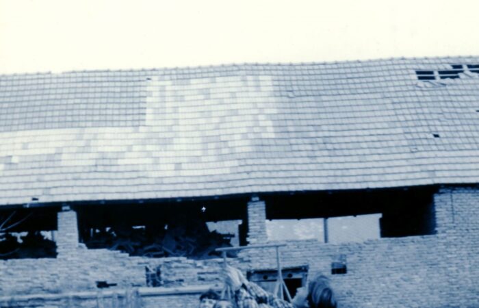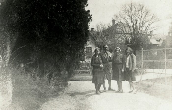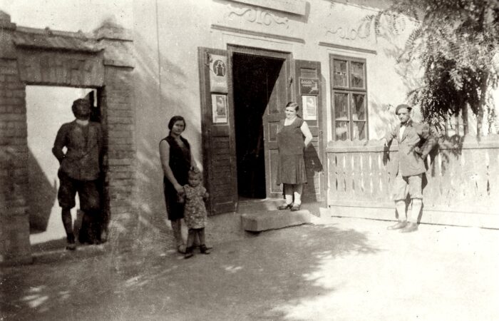 A karvai Tulipán utcai Veszna „bót” és a mellette lévő kocsma előtt balról Sabla József („Tyatya” szül. 1914), Varga Manci, kislánya Bözsike, Palkovics Lina néni (első férje Gunics) és Török Pista, 1930-ban.