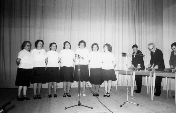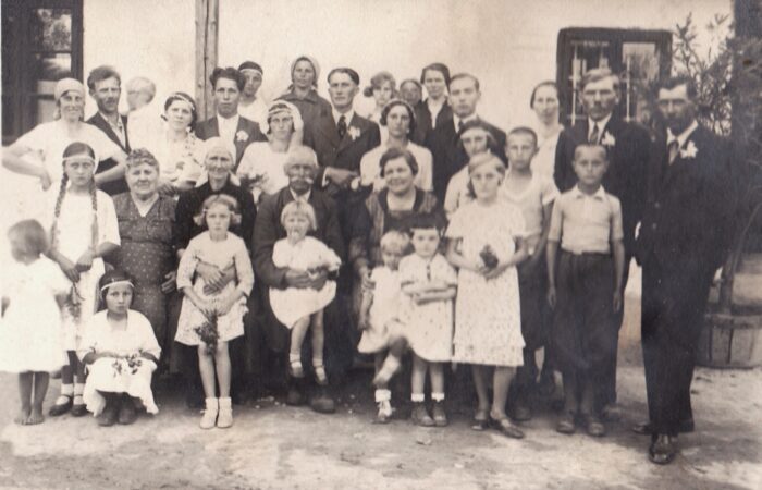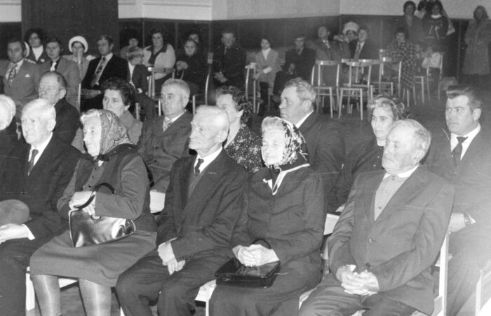 Arany- és ezüstlakodalmi ünnepség a kultúrházban, ahol fellépett a karvai énekkar. Jobbról első sor Mráz Pista és Ilcsi, Mitas Pista és Juliska, Mihalik József és Margit – aranylakodalmasok, hátsó sor jobbról Rusznyák Imre és Manci, Gyekes sógor és Manci, Duka Imre és Ilonka, Danázs Ferenc és Ilona, 1980-as évek eleje.