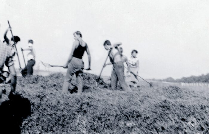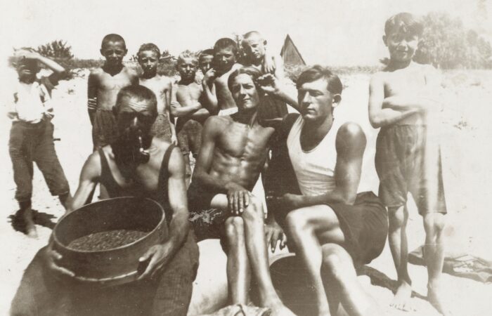 A karvai aranymosók, halászok. Jobbra Sabla Tyatya és a kubikusok Misa bácsi és fia – Kereki Nándor, gyerekek hátul Szűcs Pista, másik felén Gulyás Sanyi, 1933-ban.