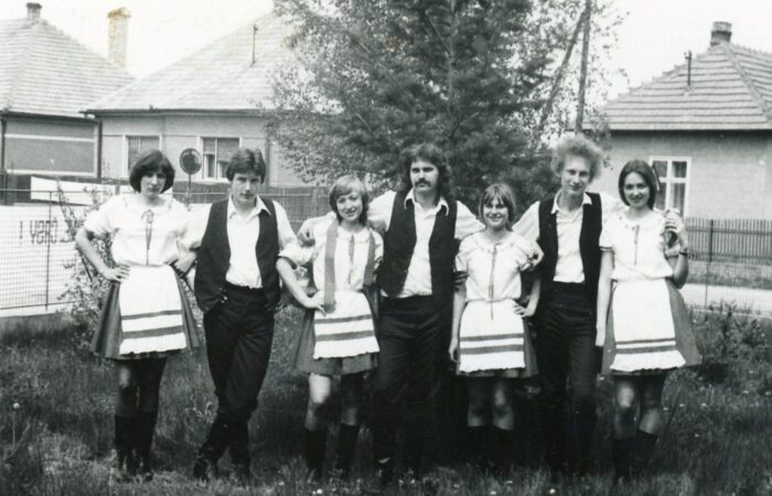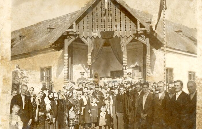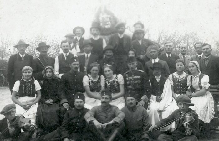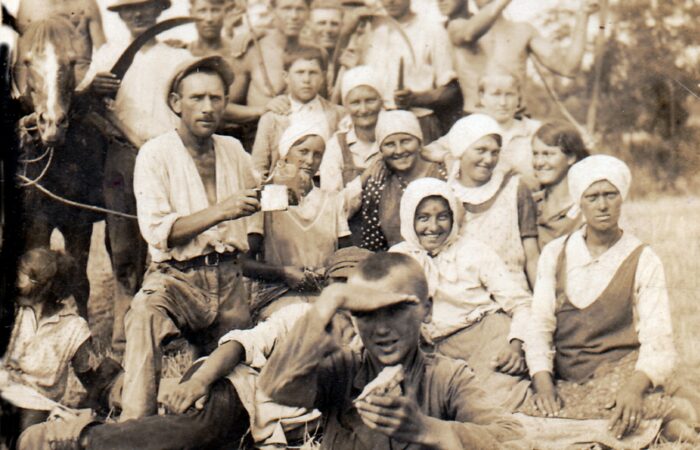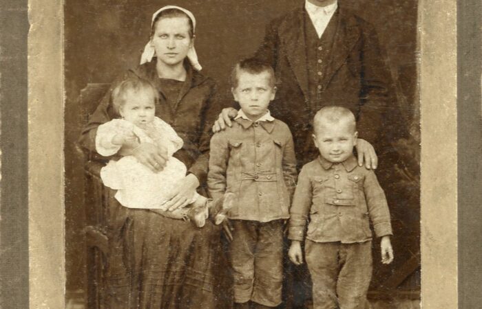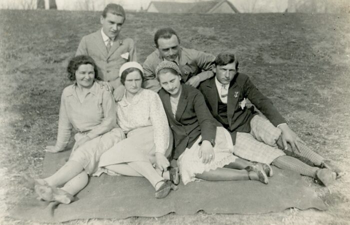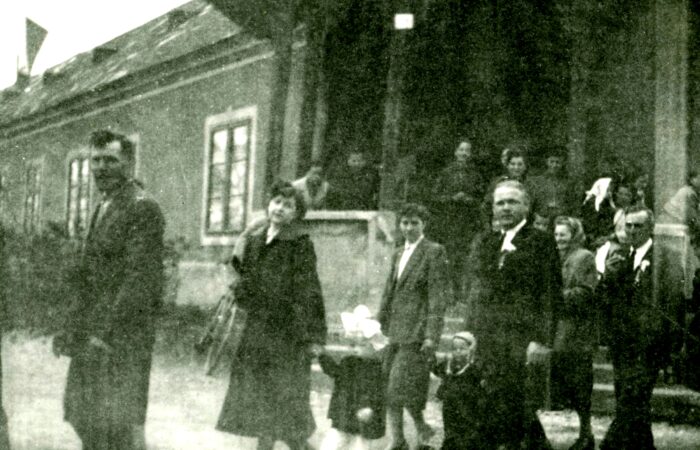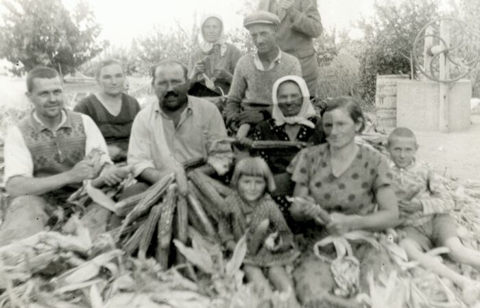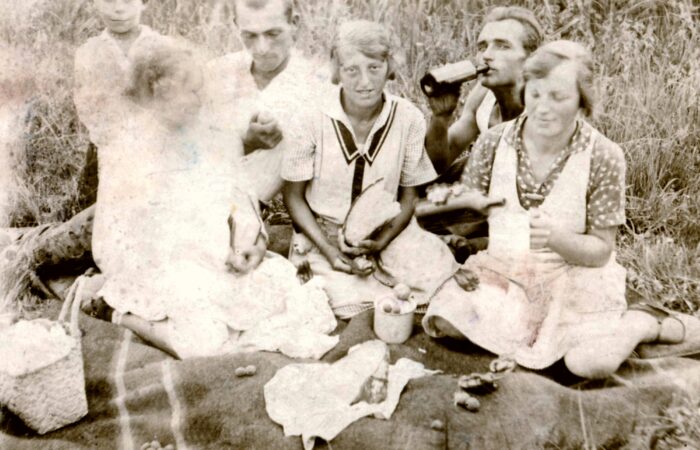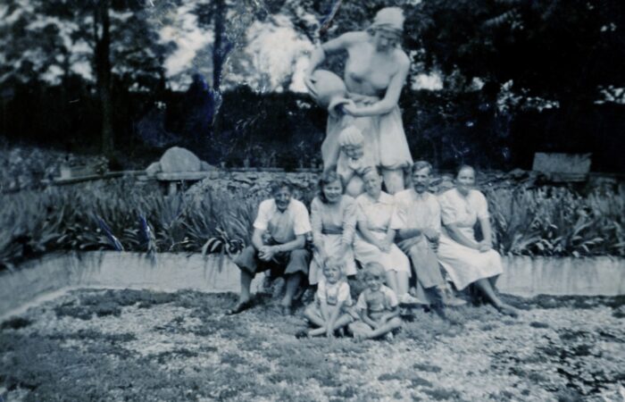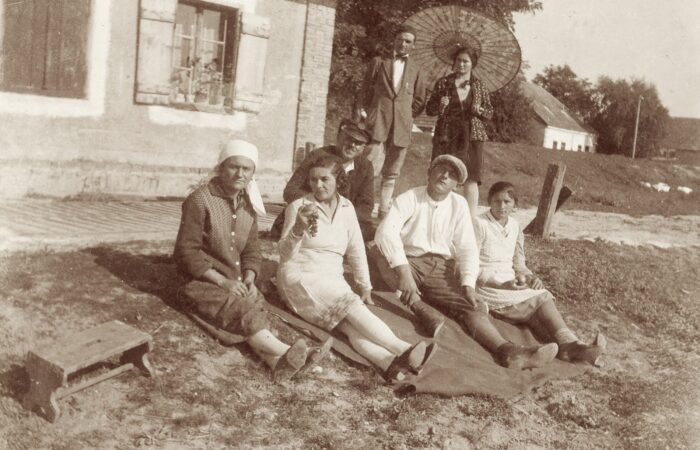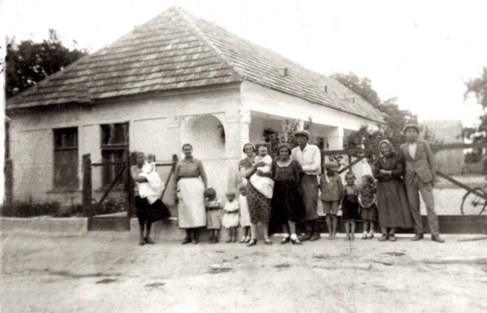 Az öreg Psenák ház a Tulipán utcában, 131-es házszám alatt. Balról Mihalik Margit, Józsikával, aki a háború alatt meghalt torokgyíkban. Psenák Mária, gyermekével Józsikával, XX, XX, Mráz Ilcsi néni gyermekével, Bözsikével, Muca néni varrónő, Sabla József (Tyatya), XX, Mráz Pistike, Margit Ilonka, Margitné Júlia – Julcsa néni, XX, 1933.