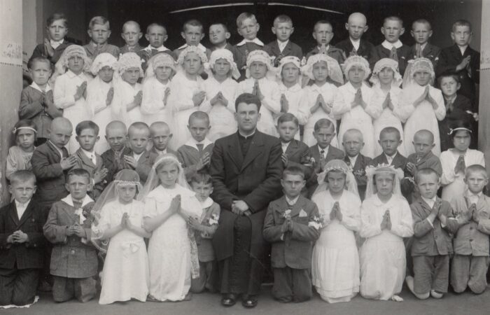 Vága, 1939. esztendőben Bérmálkozók Borsos Mihály plébánossal. Hátsó sor balról jobbra: Forró István, Forró István, Kamenár Ferenc, ?, Ladovics József, Jalsovszky József, Forró Zoltán, Forró János, Fördős, Zsigó Tibor, Forró-Zelinka István, ?, Renács Ede. Előttük balról jobbra: Szabó Pál, Puskás Erzsébet, Puskás Ilona, Kamenár Rozália, Szabó Júlia, Czakó Mária, Knézel, Puskás Mária, Forró Rozália, Puskás...