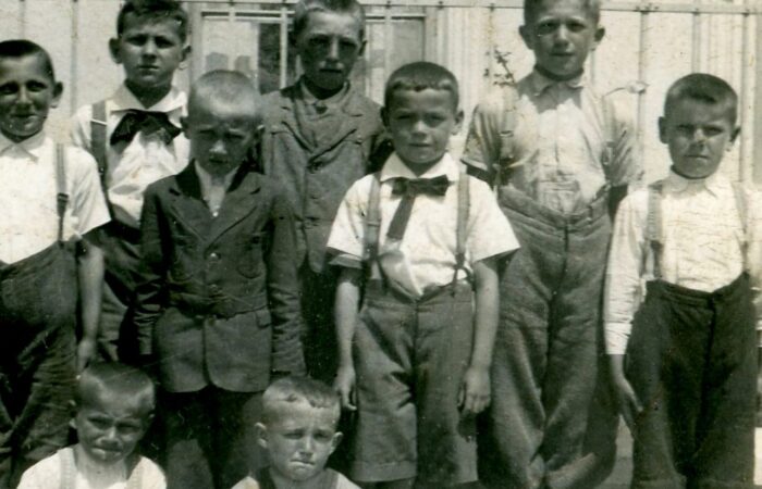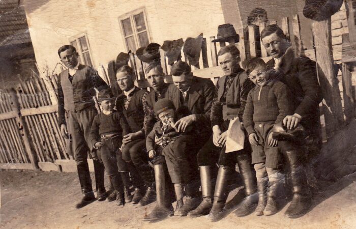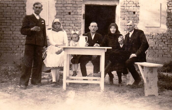A fényképen Dékany János (szül. 1893), Julianna (szül. 1904), Dezső, Margitka és Elek (szül. 1923) látható a borházsoron – hajloknál üldögélve.