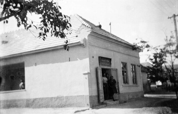 Balról Makai Miklós, Vörös Lajcsi, Rancsó Miklós, Szórad Ferenc, Péczi Miklós, Vörös Ernő, Paluska Gyula, Zajos Miklós ül és Zajos Gyula 1940-ben, a községi hivatal épülete előtt.