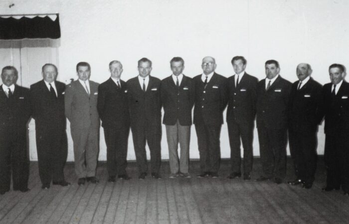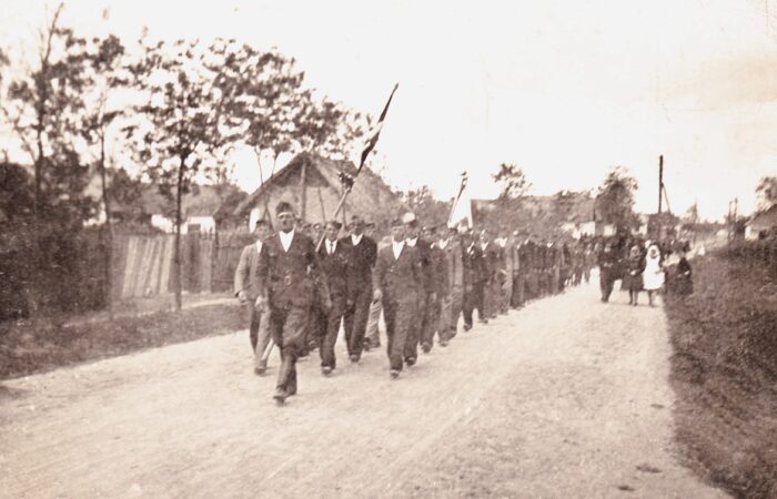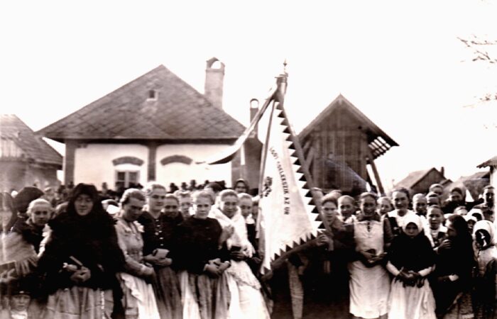 A képen a hetényieket a régi kultúrház és a dohányszárító előtt láthatjuk egy egyházi ünnepi felvonuláson.