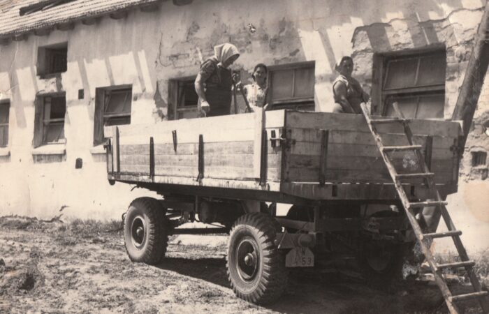 A fényképen 1975-ben a Tanyán Sebőkné Szalai Margit, Paluskáné Kosdi Ilonka és Csizmadiáné Rancsó Eszter a gabonát takarítják be.