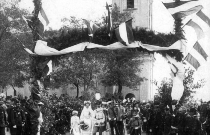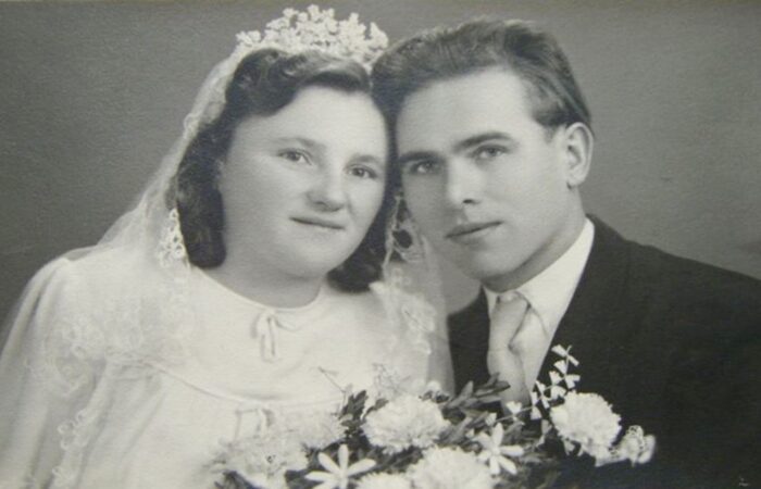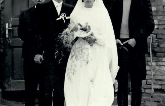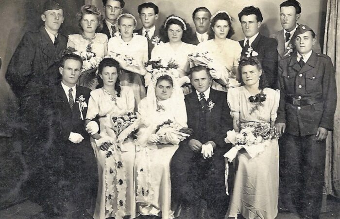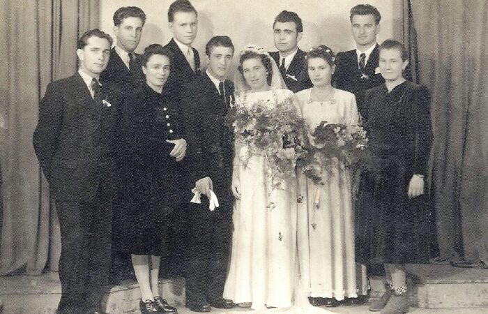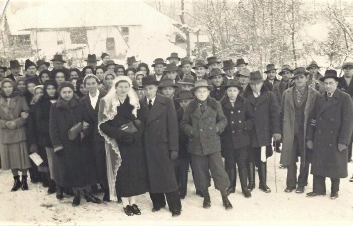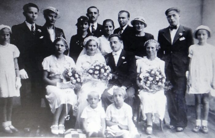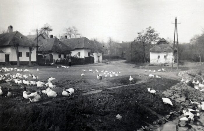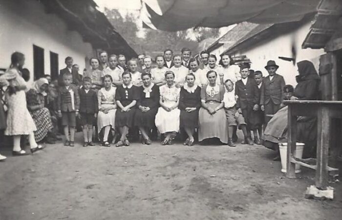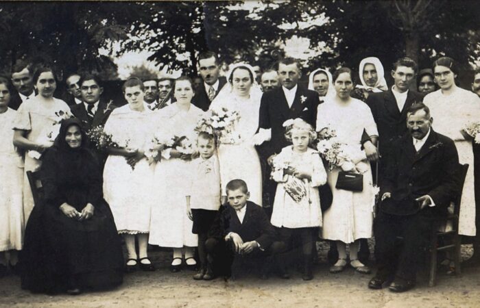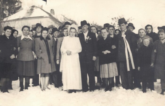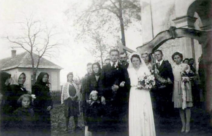 A katolikus templom előtt egy házaspár, mögöttük a lakodalmi zenekar: a prímás Sipos Dezső (Pisi), a harmonikás ifjabb Sipos Dezső, a klarinétos ismeretlen. Abban az időben cigányzenekar húzta a lakodalmakban a talp alá valót. A Pisi zenekaron kívül még a Farkas zenekar működött a faluban.