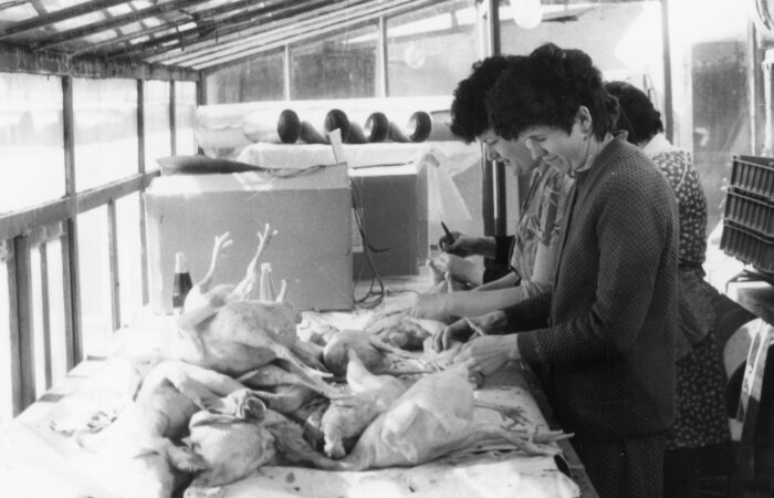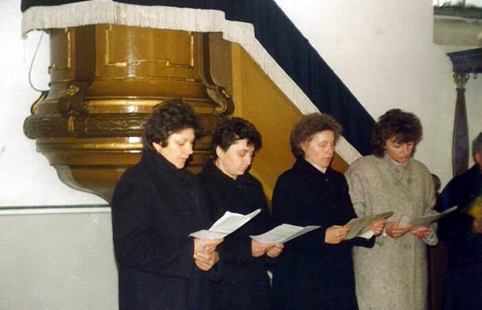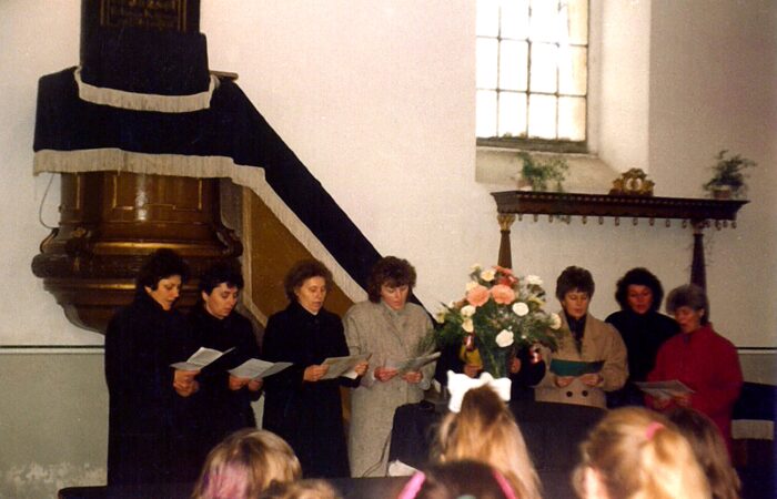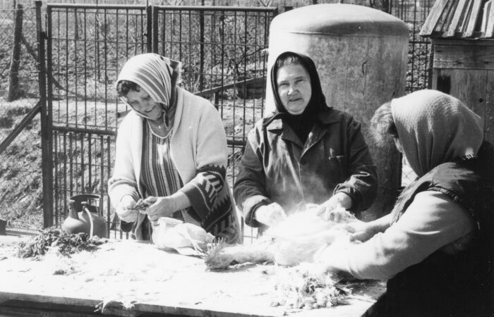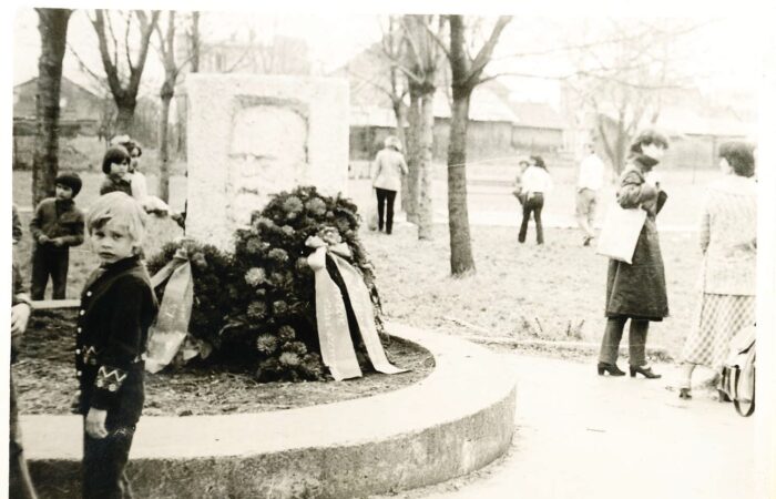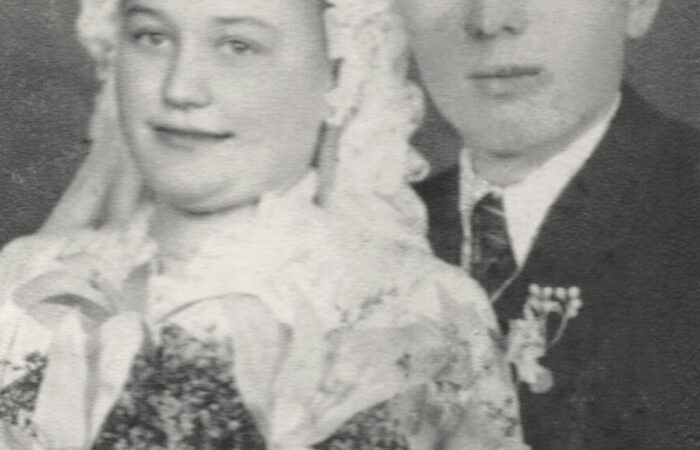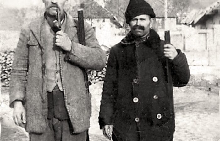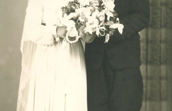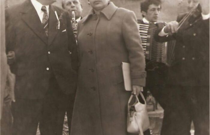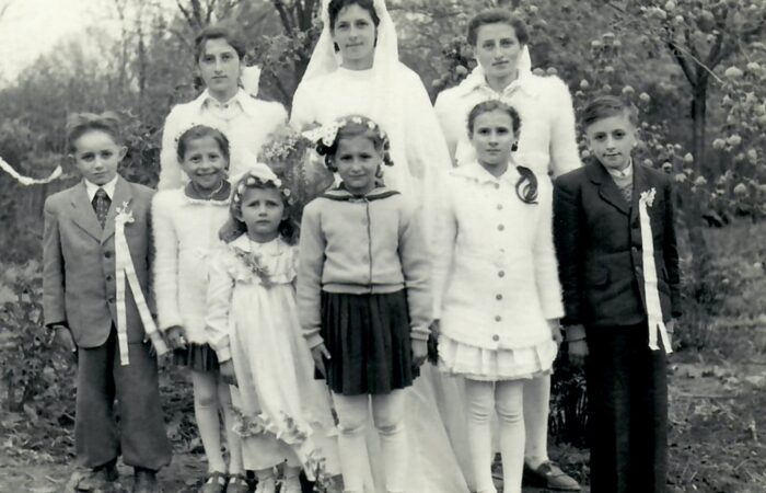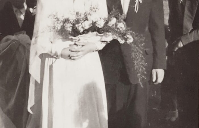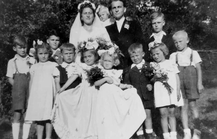 A katolikus templom előtt egy házaspár, mögöttük a lakodalmi zenekar: a prímás Sipos Dezső (Pisi), a harmonikás ifjabb Sipos Dezső, a klarinétos ismeretlen. Abban az időben cigányzenekar húzta a lakodalmakban a talp alá valót. A Pisi zenekaron kívül még a Farkas zenekar működött a faluban.