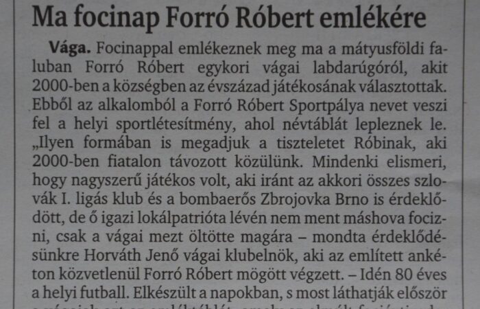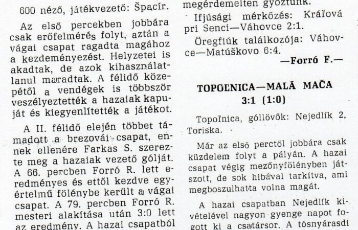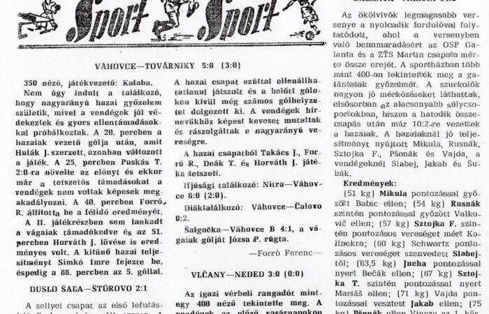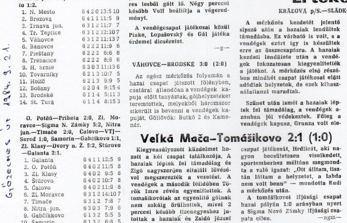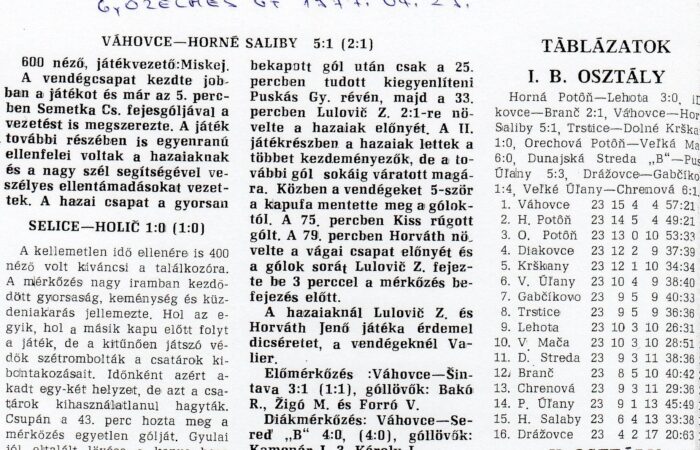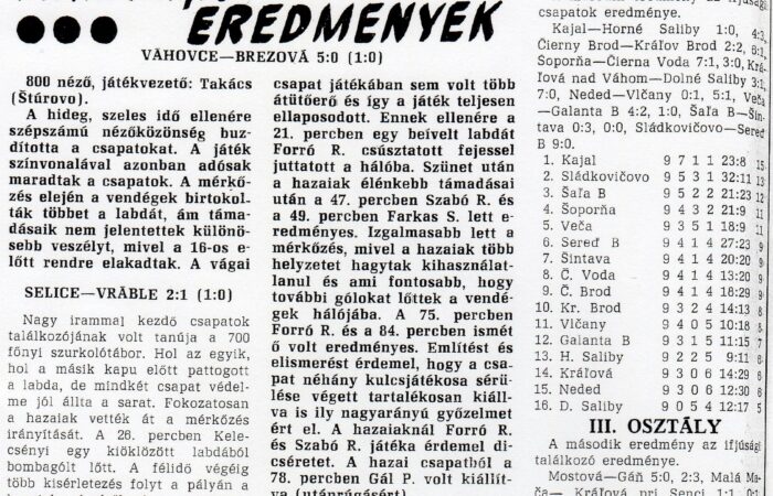 Vága, 1980-as évek elején A fotón: Kozmér Lambert, Farkas Róbert, Zsigó Róbert, Forró Zoltán, Lukács Róbert, Takács Ferenc, Józsa István, Simkó Péter, Farkas Miklós, Bakó György, Kamenár Kálmán, Farkas Gyula, Zsigó Róbert, Bakó Ernő… Abban az időben, a másik mátyusföldi csapat, a Taksony csapatával játszottak a vágaiak igazi rangadót az osztályban. A vágai tribünön akkoriban...