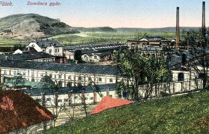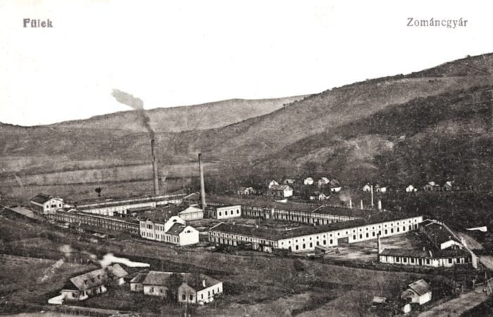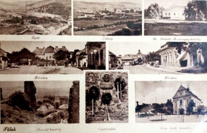A képeslapon egy gyár, illetve a füleki táj és egy emléktábla is megtalálható.
