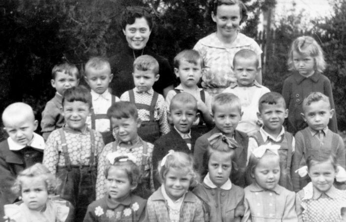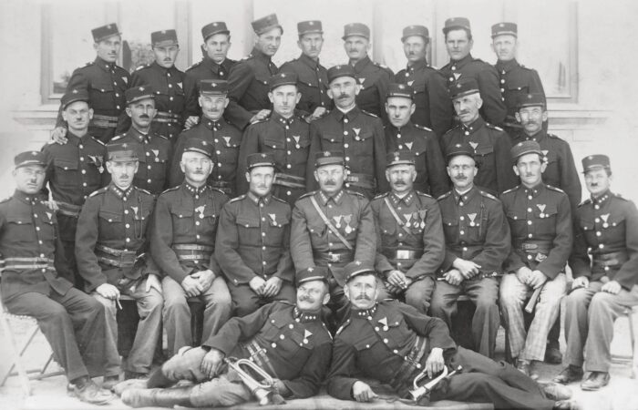 Tűzoltók név szerint. Felső sor balról: Bognár Lajos, Csémi József, Fekete József, Farkas Vince, Bódis Jóska, Sül Vince, Mészáros Lajos, Farkas István, Nagy Gyula Középső sor: Farkas Jenő, Hordosi Ferenc, Kiss Miska, Budai János, Kálmán Sándor, Horony János, Kiss Imre, Bögi György Alsó sor: Elek János, Nyársik István, Fekete János, Filkász László, Molnár Gyula, Nagy...