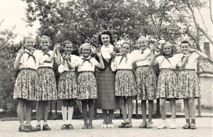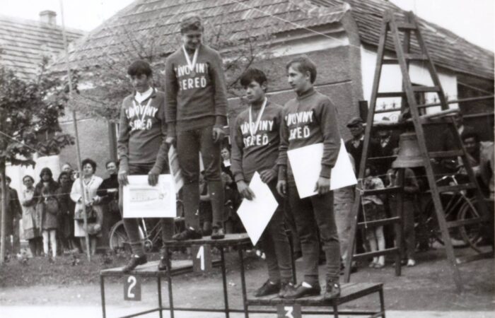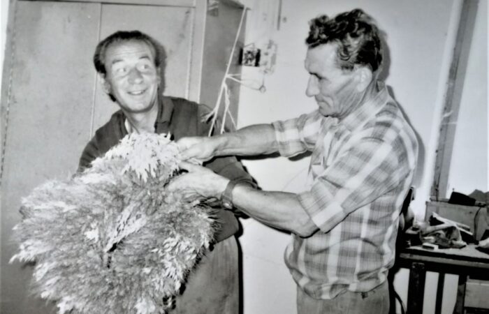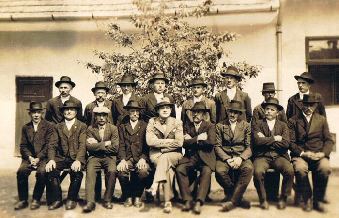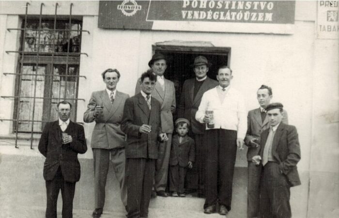 Vága, XX. század közepén A mázsaháznál, amely Kertalján, a mai Forró Imre üzletével átellenben volt; az alapokat még a két pad mellett látni. Balról jobbra: Forró Károly, ?, ?, Forró József (átellenben lakott, a kulcsok is nála voltak), Szabó János, Forró Antal, Kiácz Jenő, Mojzes Dezső, Lukács Ernő, ?, Bakó István, ?, ?.