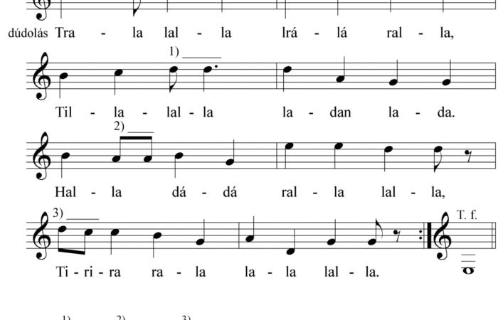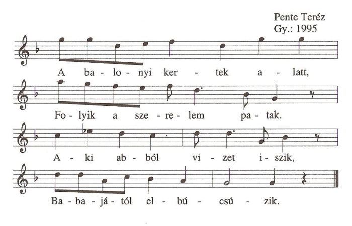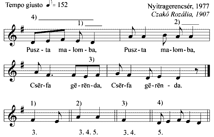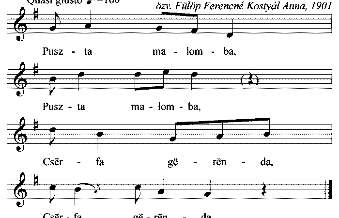 Puszta malomba, Puszta malomba, Csërfa gërënda, Csërfa gërënda. Arrë illënë, Arrë illënë, Egy gólya asszony, Egy gólya asszony. Mit búsulsz,...