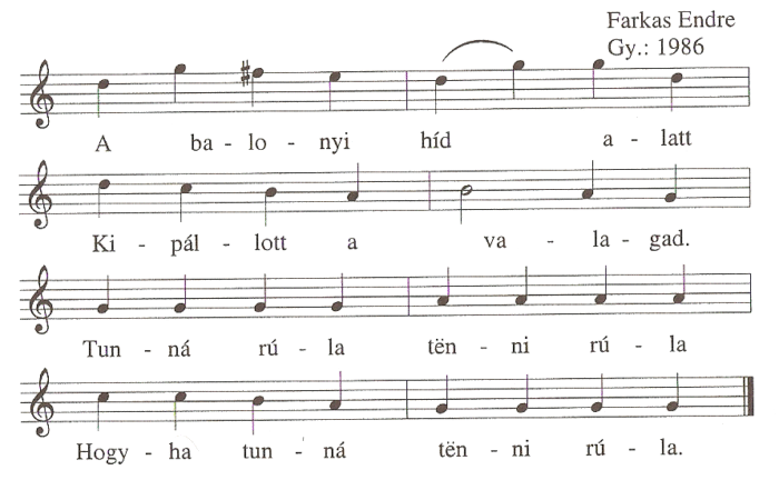 1. A balonyi híd alatt,Kipálott a valagad.Tunná rúla tënni rúla,Hogyha tunná tënni rúla.2. Sárga a liba bögye,Nincsen aki megëgye.Hogyha tunná...