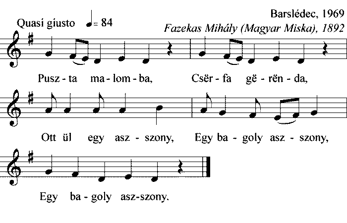 Puszta malomba, Puszta malomba, Csërfa gërënda, Csërfa gërënda. Ott ül ëgy asszony, Ott ül ëgy asszony, Egy bagol asszony, Egy...