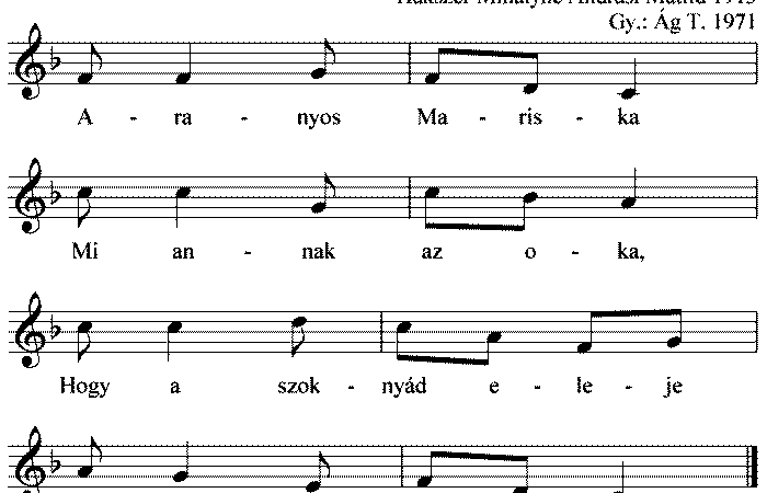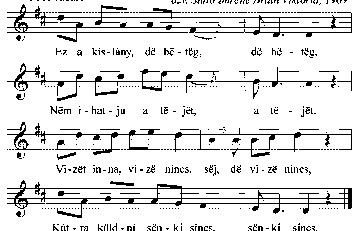Puszta malomba, Puszta malomba, Csërfa gërënda, Csërfa gërënda. Azonn üldögél, Azonn üldögél, Ëgy bagolyasszony, Ëgy bagolyasszony. Mért sírsz, mért bánkódsz,...