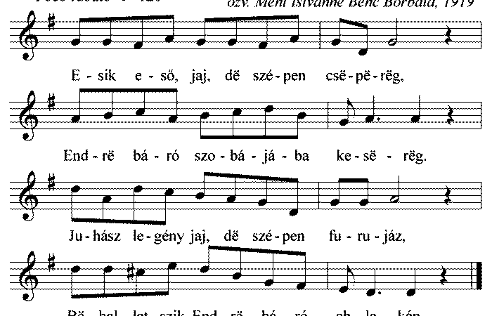 Esik eső, jaj, dë szépën csëpërëg, Endre báró szobájába kesërëg. Juhász legény, jaj dë szépen furujáz, Bëhallatszik Endrë báró ablakán....