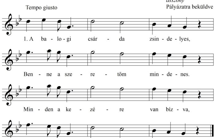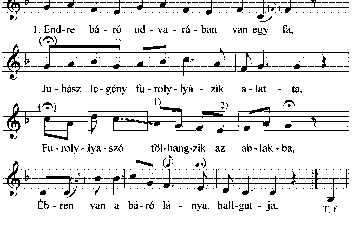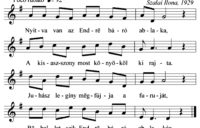 Nyitva van az Endrë báró ablaka, A kisasszony most könyököl ki rajta. Juhász legíny mëgfújja a furuját, Bëhallatszik Endrë báró...