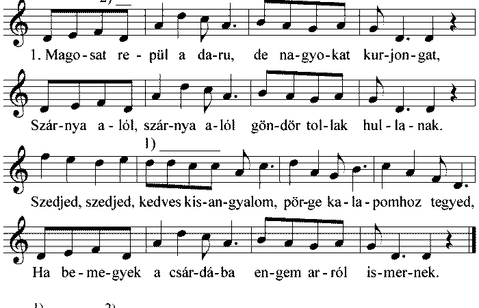 1. Magosat repül a daru, de nagyokat kurjongat, Szárnya alól, szárnya alól göndör tollak hullanak. Szedjed, szedjed, kedves kisangyalom, pörge...