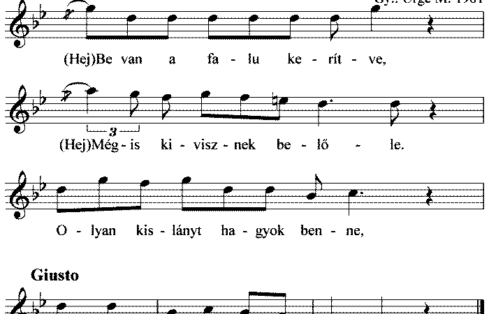 1. (Hej) Be van a falu kerítve, (Hej) Még is kivisznek belőle. Olyan kislányt hagyok benne, (Hogy) holtig fáj a...