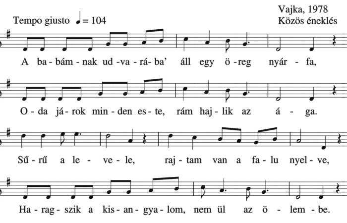 A babámnak udvarába’ áll egy öreg nyárfa, Oda járok minden este, rám hajlik az ága. Sűrű a levele, rajtam van...