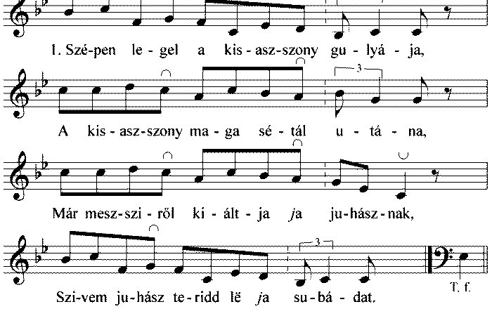 1. Szépen legel a kisasszony gulyája, A kisasszony maga sétál utána, Már messziről kiáltja ja juhásznak, Szivem juhász, teridd lë...