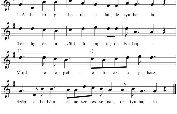 1. A balogi berek alatt, de tyuhajla, Térdig ér a zöld fű rajta, de tyuhajla, Maj‘ lelegelteti jazt a juhász,...