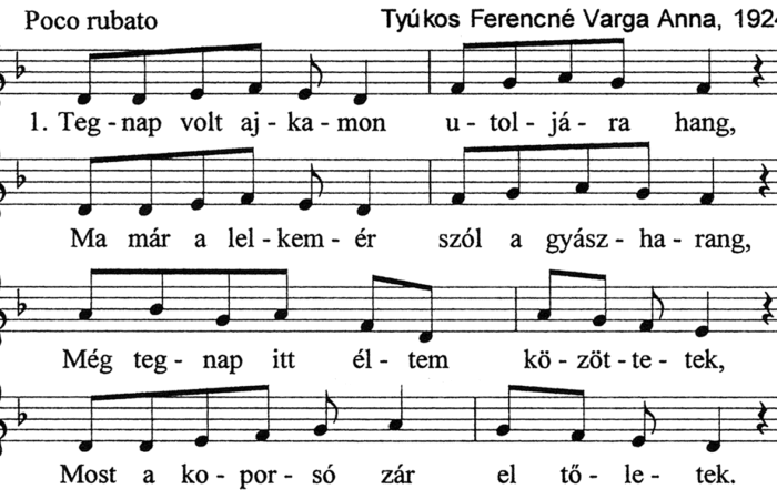 1. Tegnap volt ajkamon utoljára hang,Ma már a lelkemér szól a gyászharang,Még tegnap itt éltem közöttetek,Most a koporsó zár el...