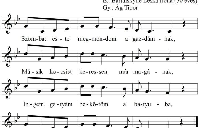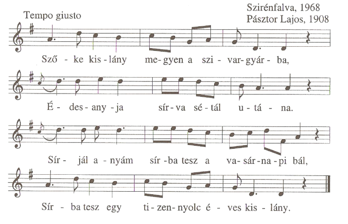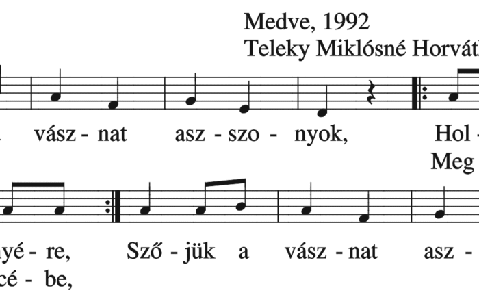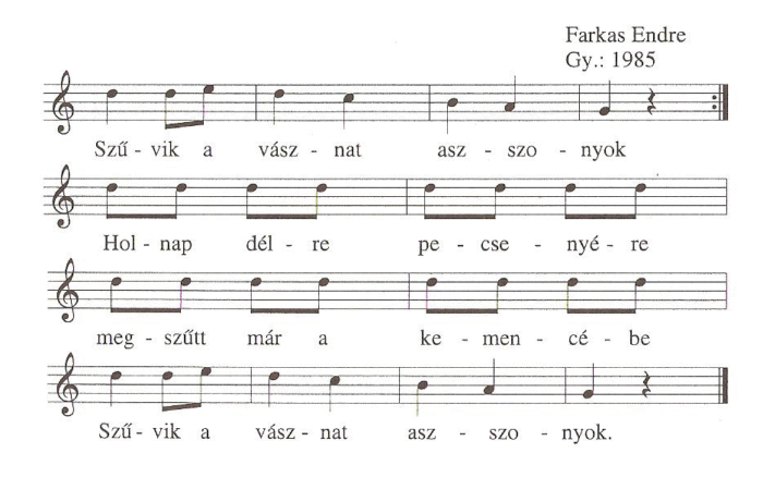 Szőjük a vásznat asszonyok, Holnap délre pecsernyére, Megsült már am kemencébe, Szőjük a vásznat asszonyok.