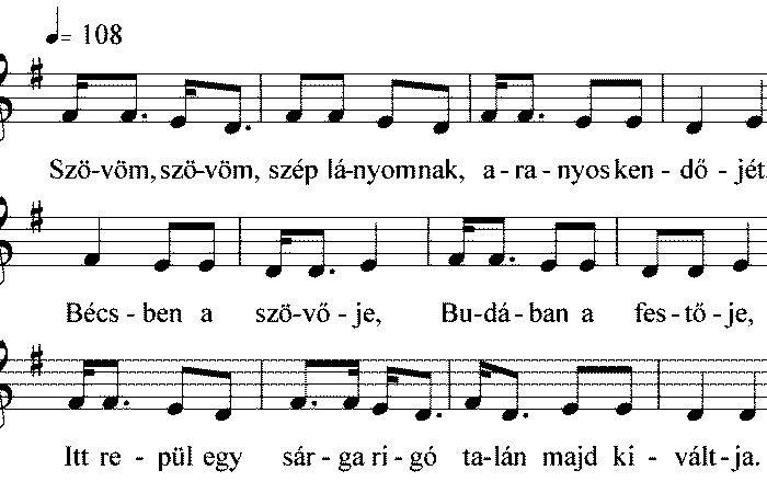 1. Szövöm, szövöm, szép lányomnak, aranyos kendőjét,Bécsben  szövője, Budán a festője,Itt repül egy sárga rigó talán majd kiváltja.– Ki házán...
