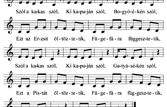 1. Szól a kakas szól, Ki kapuján szól, Bogyóéknál szól, Ezt az Erzsit öltöztetik, Fügefára függesztetik, Szól a kakas szól,...