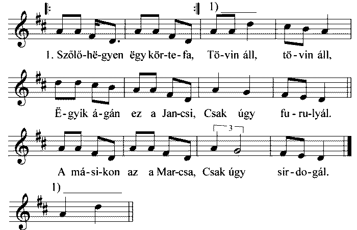 1. Szőlőhegyen egy körtefa, Tövin áll, tövin áll, Egyik ágán ez a Jancsi, Csak úgy furulyál. A másikon az a...