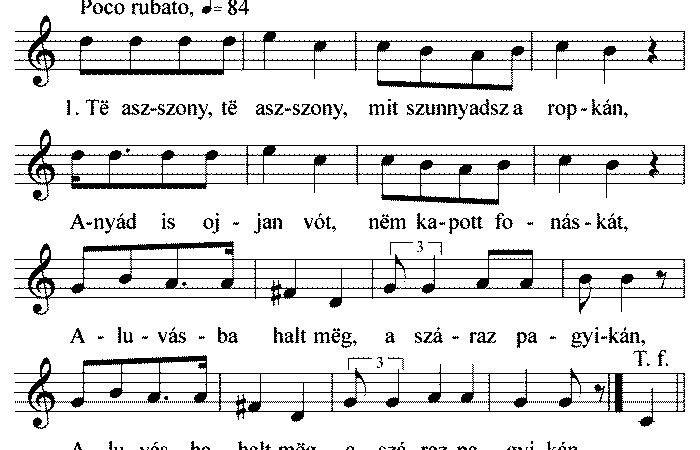 1. Te asszony, te asszony, mit szunnyadsz a ropkán, Anyád is ojjan vót nem kapott fonáskát, Aluvásba halt meg a...