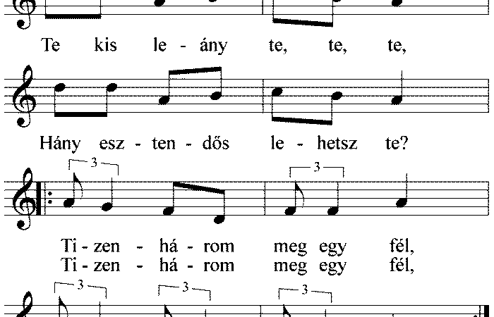 Te kisleány, te, te, te, Hány esztendős lehetsz te? Tizenhárom meg egy fél, Talán tizennegyedfél.