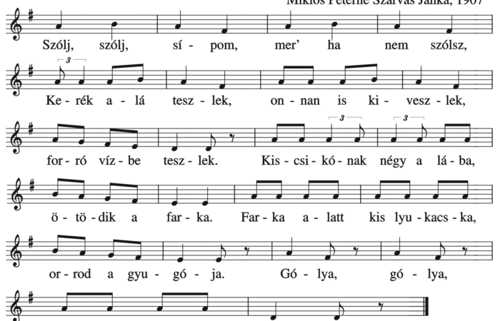 Szólj, szólj, sípom, mer” ha nem szólsz, Kerék alá teszlek, onnan is kiveszlek, Forró vízbe teszlek. Kiscsikónak négy a lába,...