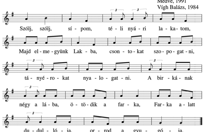 Szólj, szólj, sípom, Téli nyári lakatom, Majd elmegyünk Lakba, Csontokat szopogatni, Tányérokat nyalogatni. A birkának négy a lába, Ötödik a...