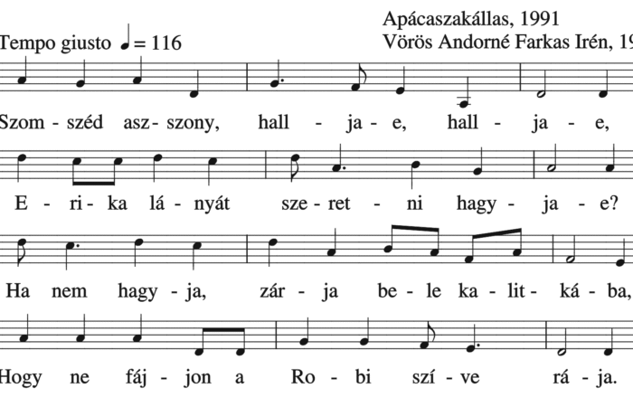 Szomszédasszony, hallja-e, hallja-e? Erika lányát szeretni hagyja-e? Ha nem hagyja, zárja bele kalitkába, Hogy ne fájjon a Robi szíve rája.