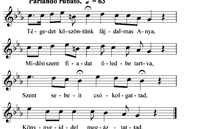 1. Téged köszöntünk fájdalmas Anya, Midőn szent fiadat öledbe tartva, Szent sebeit csókolgattad, Könnyeiddel megáztattad. 2. Mi is hozzád jöttünk...