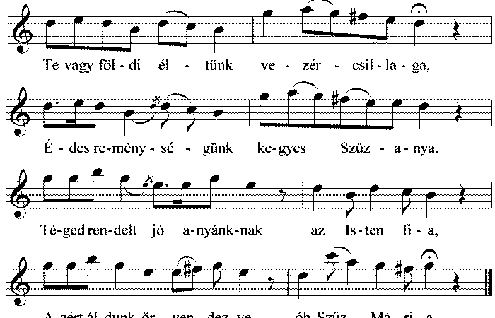 1. Te vagy földi éltünk vezér csillaga, Édes reménységünk kegyes Szűzanya. Téged rendelt jó anyánknak az Isten fia, Azért áldunk...