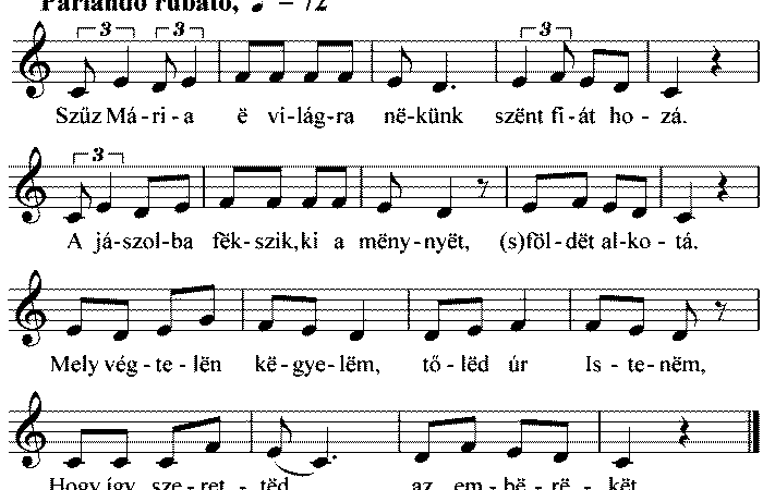 1. Szűz Mária ë világra nëkünk szënt fiát hozá. A jászolba fëkszik, ki a mënnyët, (s)földët alkotá. Mely végtelën këgyelëm,...