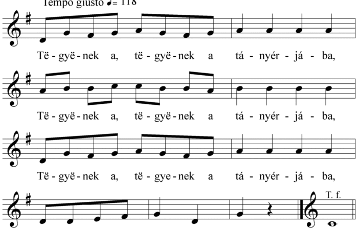 Tëgyënek a tëgyënek a tányérjába, Tëgyënek a tëgyënek a tányérjába, Tëgyënek a tëgyënek a tányérjába, Tëgyënek a tányérjába!