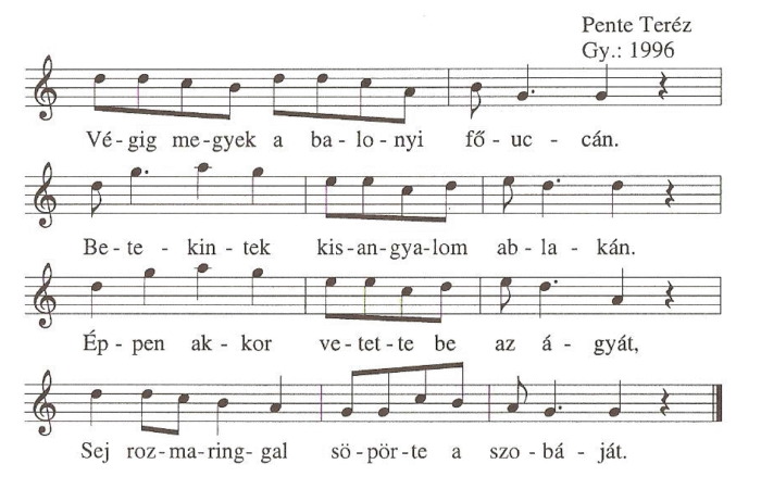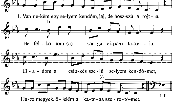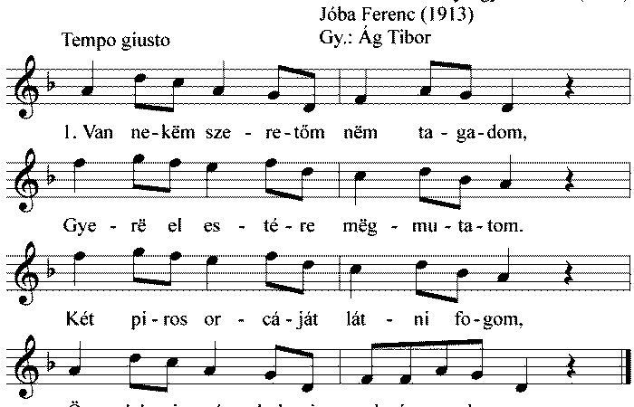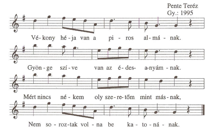 1. Vékony héja van a piros almának.Gyönge szíve van az édesanyámnak.Mért nincs nékem oly szeretőm mint másnak,Nem soroztak volna be...