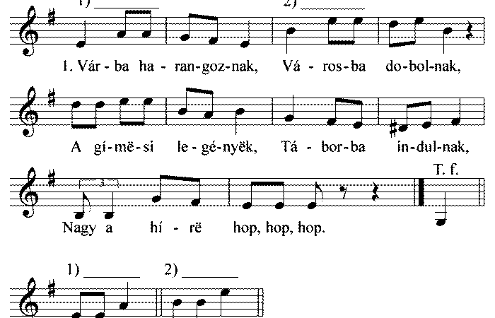 1. Várba harangoznak, Városba dobolnak, A gímesi legények, Táborba indulnak, nagy a híre hop, hop, hop. 2. Ki lësz a...