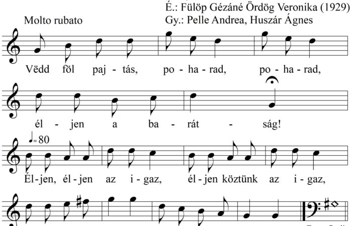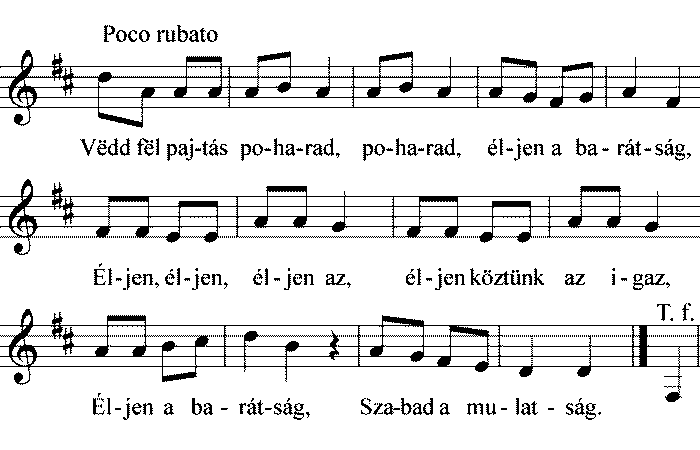 Vedd fel, pajtás, poharad, poharad, Éljen a barátság! Éljen, éljen az igaz, éljen köztünk az igaz, Az igaz barátság, szabad...