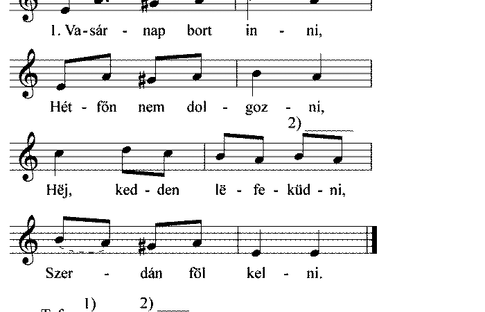 1. Vasárnap bort inni, Hétfőn nem dolgozni, Hej, kedden lefeküdni, Szerdán fölkelni. 2. Csütörtökön írni, Pénteken számolni, Hëj, szombaton kérdezni,...