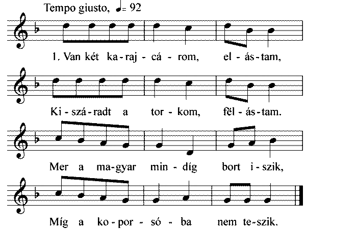 1. Van két krajcárom elástam, Kiszáradt a torkom felástam, Mer a magyar mindig bort iszik, Míg a koporsóba nem teszik....