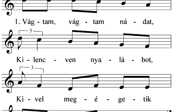 1. Vágtam, vágtam nádat, Kilencven nyalábot, Kivel megégetik Az öreg anyádat. 2. Elvennélek rózsám, Ha megtudnád tenni, Mácsonya csepűből Cérnát...